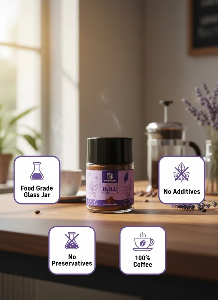 Meet your new favorite pick-me-up! Purity Beans Bold Instant Coffee Powder is crafted for those who crave a coffee with character—deep, intense, and unmistakably bold. Each jar is packed with hand-selected coffee beans, expertly blended and processed for a robust flavor that stands out in every cup. Whether you need a powerful start to your day or a flavorful coffee break, BOLD delivers a full-bodied, aromatic experience in an instant. Its well-rounded strength is perfect for coffee fans who want extra depth while still enjoying balanced, smooth notes.